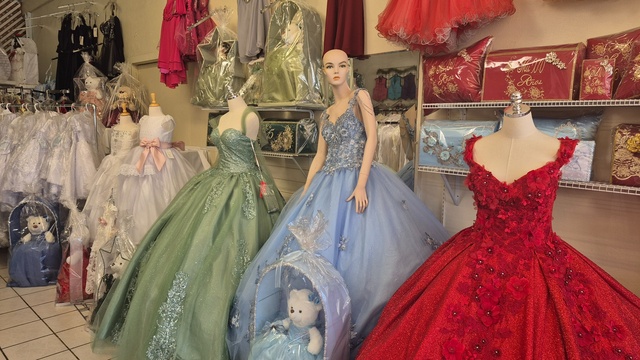 「キンセアニェーラ」と呼ばれる女の子の15歳のお祝いでは、女の子たちがお姫様のようなドレスを着ます。日本でいえば着物屋さんで七五三や成人式の着物が売っているようなものでしょうか。親が子どもの成長を喜ぶのは世界共通ですね。