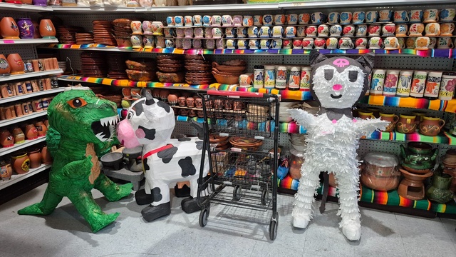 「ピニャータ」の中にキャンディなどのお菓子を詰め、ピクニックや誕生日会などではまるで「パン食い競争」のように上からひもで吊るしたものを「スイカ割り」のように目隠しをした子供たちが棒で叩いて割り、出てきたお菓子を競って集めます。手作りの様々なキャラクターの「ピニャータ」がずらりと並んでいます。